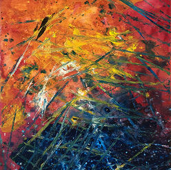 Paint as Image: Coaxed from a process of actions and reactions, my goal is to create a sense of perspective and texture and develop dynamic motion that conveys a feeling, or sense of being. Working on several paintings at the same time, I spill paint and other mediums onto a panel and simultaneously abuse and wrestle with the work. My process is to use free-flowing paint as both the medium and the tool. Amorphous forms appear to be decomposing at the very moment of inception. The converging mediums make objects upon the surface that create a focal point that sparks the imagination and creates space. The resulting images portray references to potentially actual things and present alternate forms of expression.